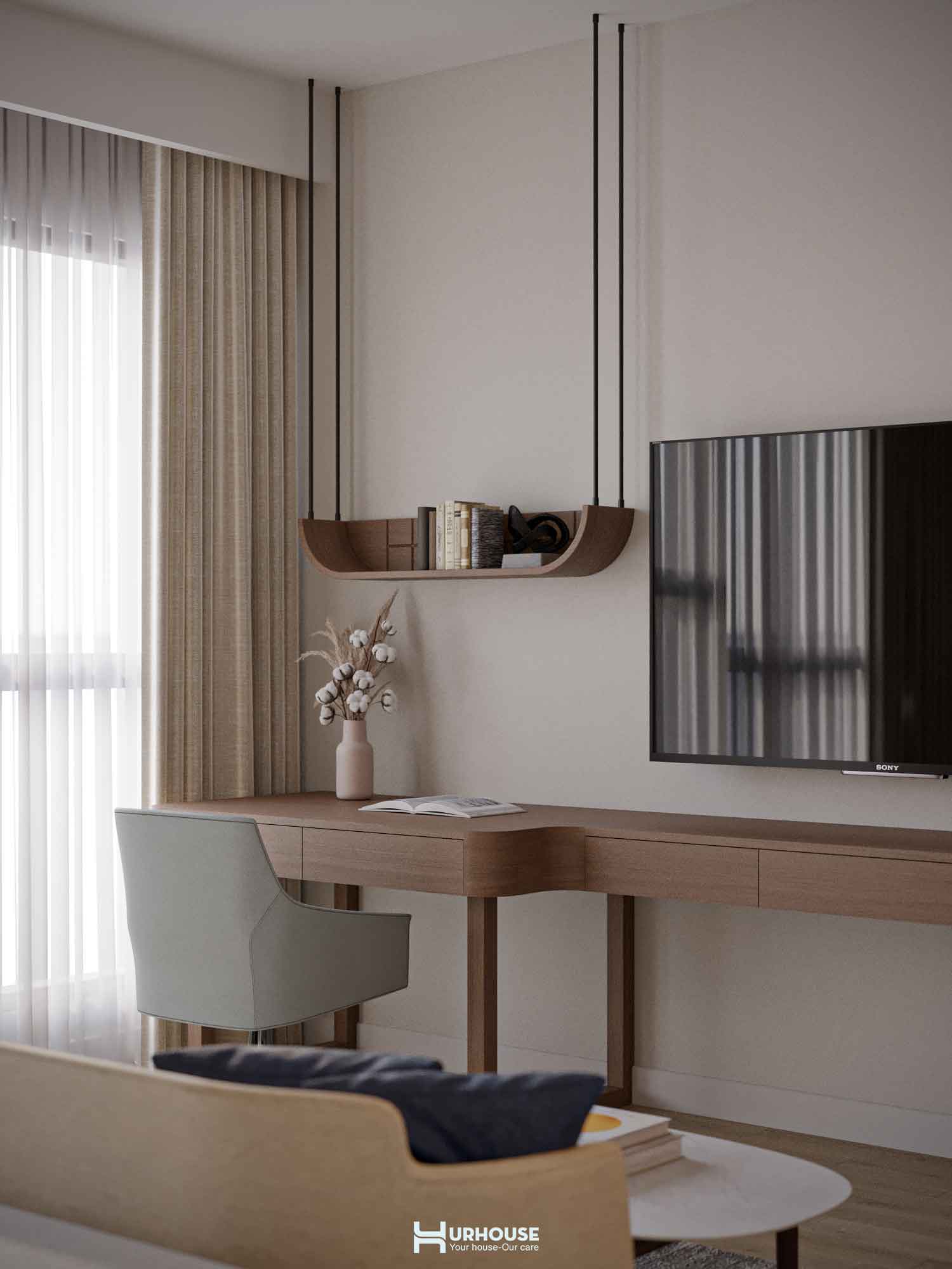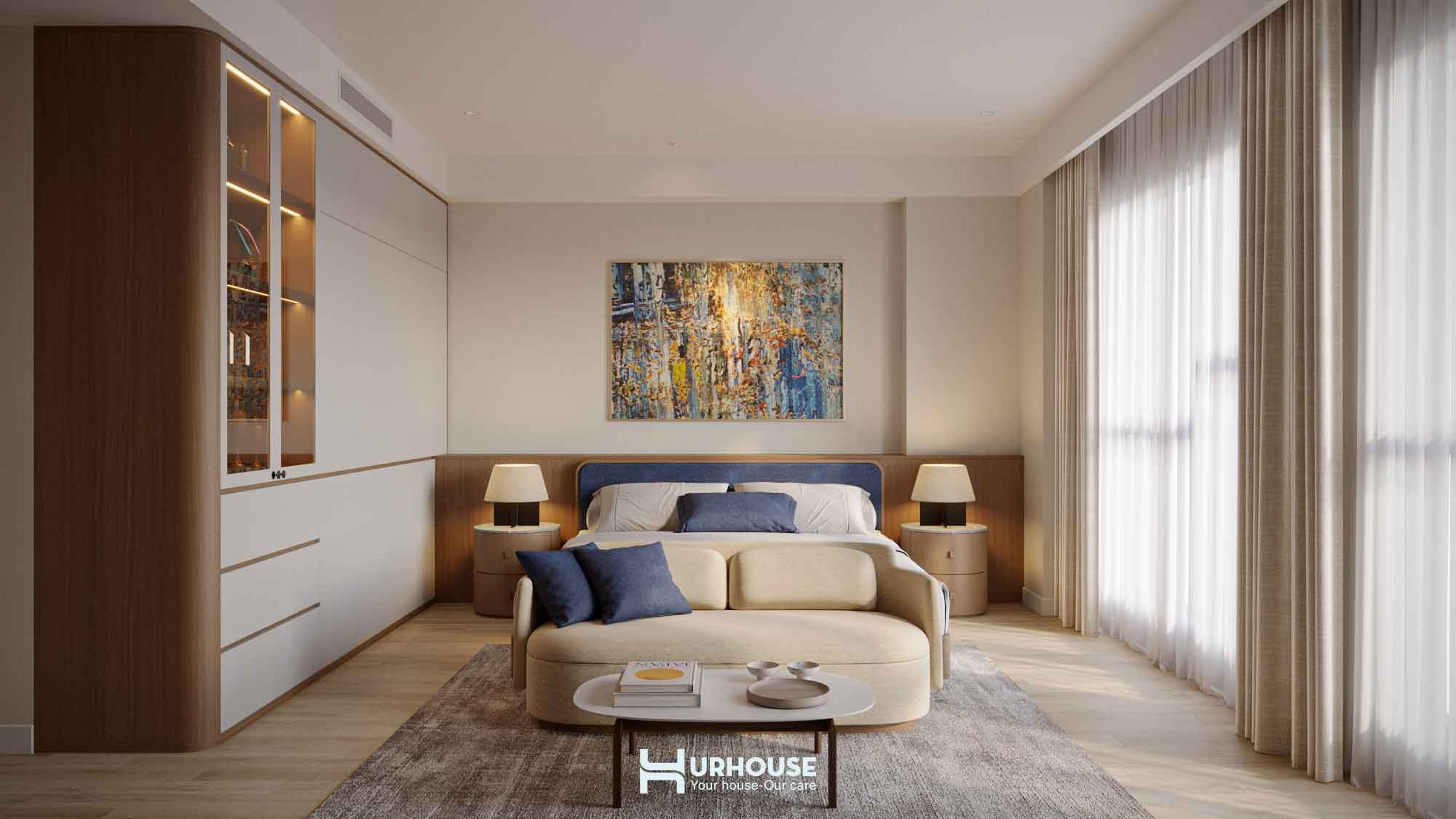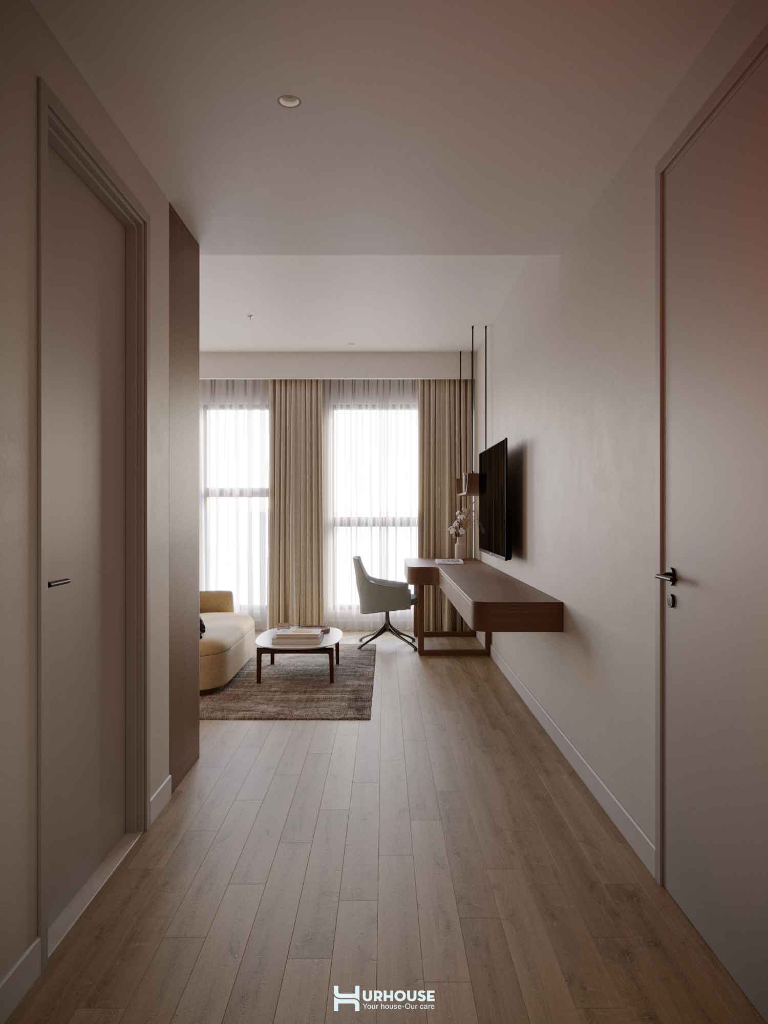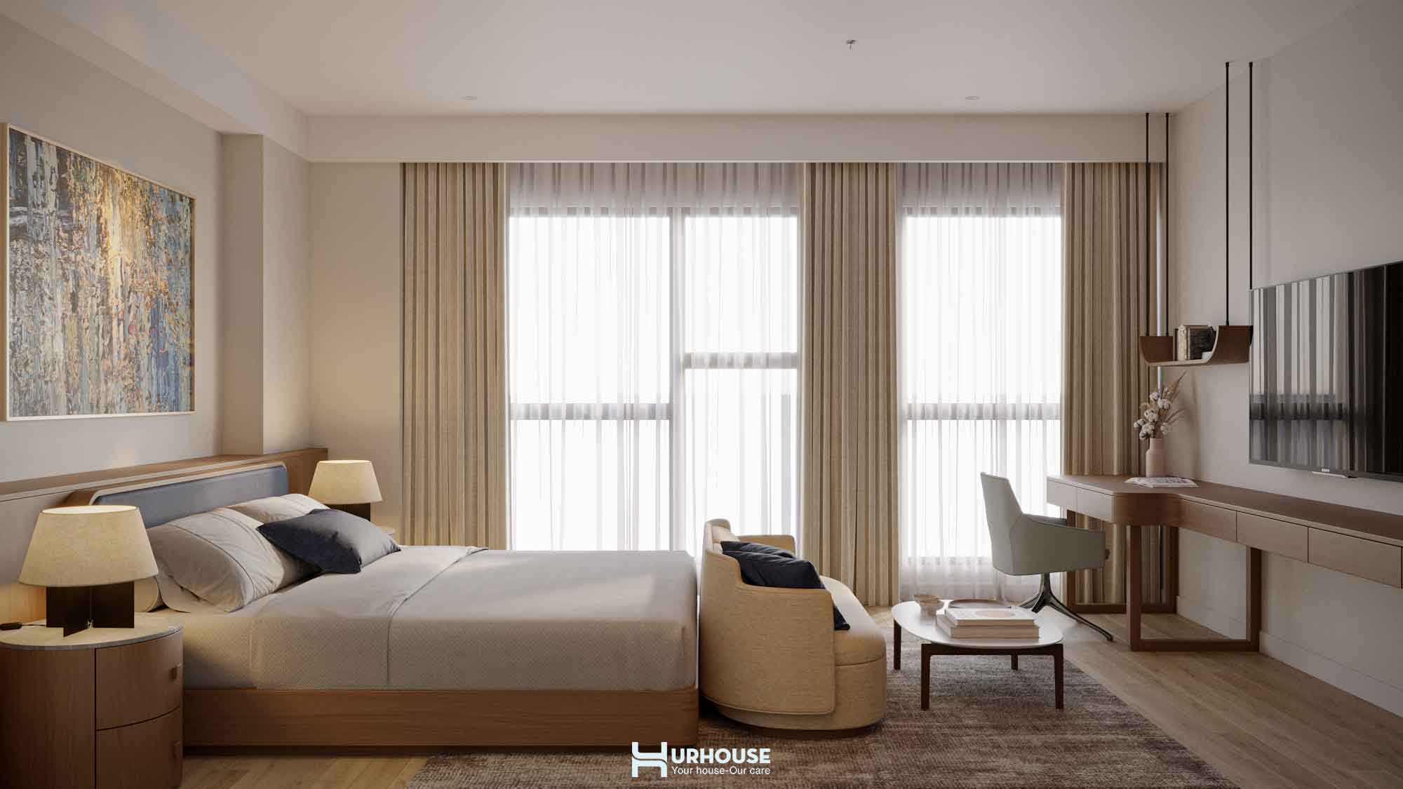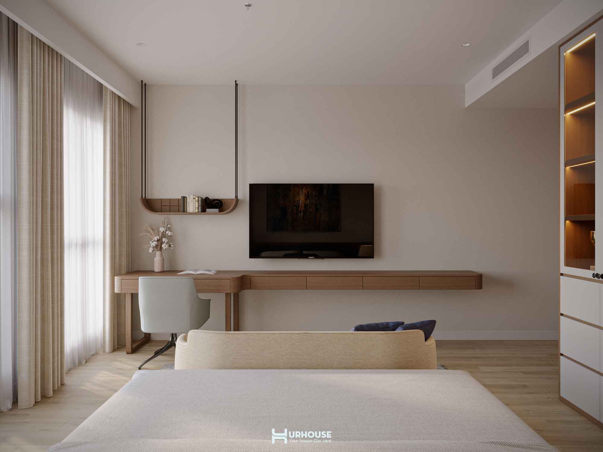 Ánh sáng tự nhiên tràn ngập khắp căn phòng qua những ô cửa sổ lớn, kết hợp cùng hệ thống rèm cửa mềm mại, tạo nên một không gian thoáng đãng và đầy đủ ánh sáng.