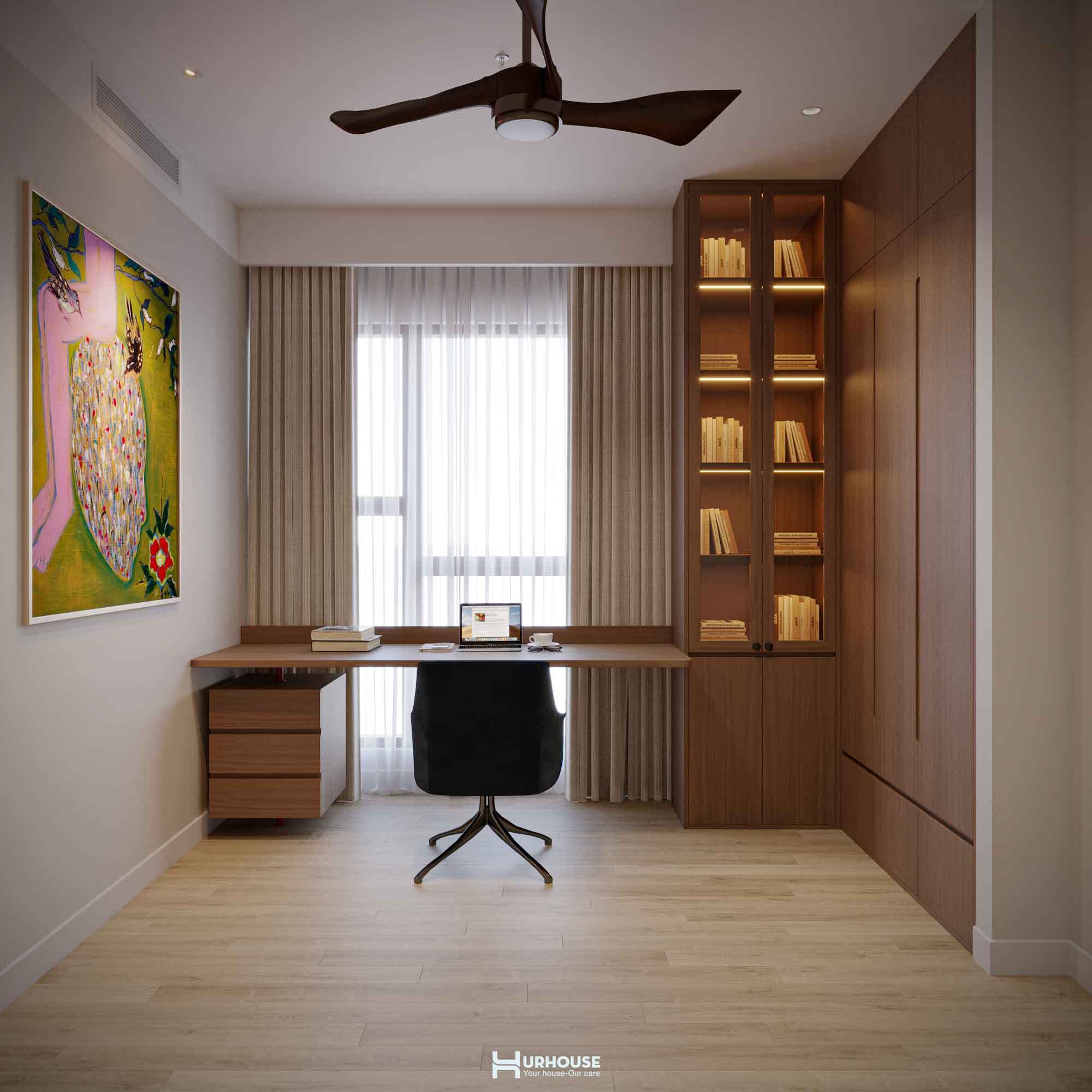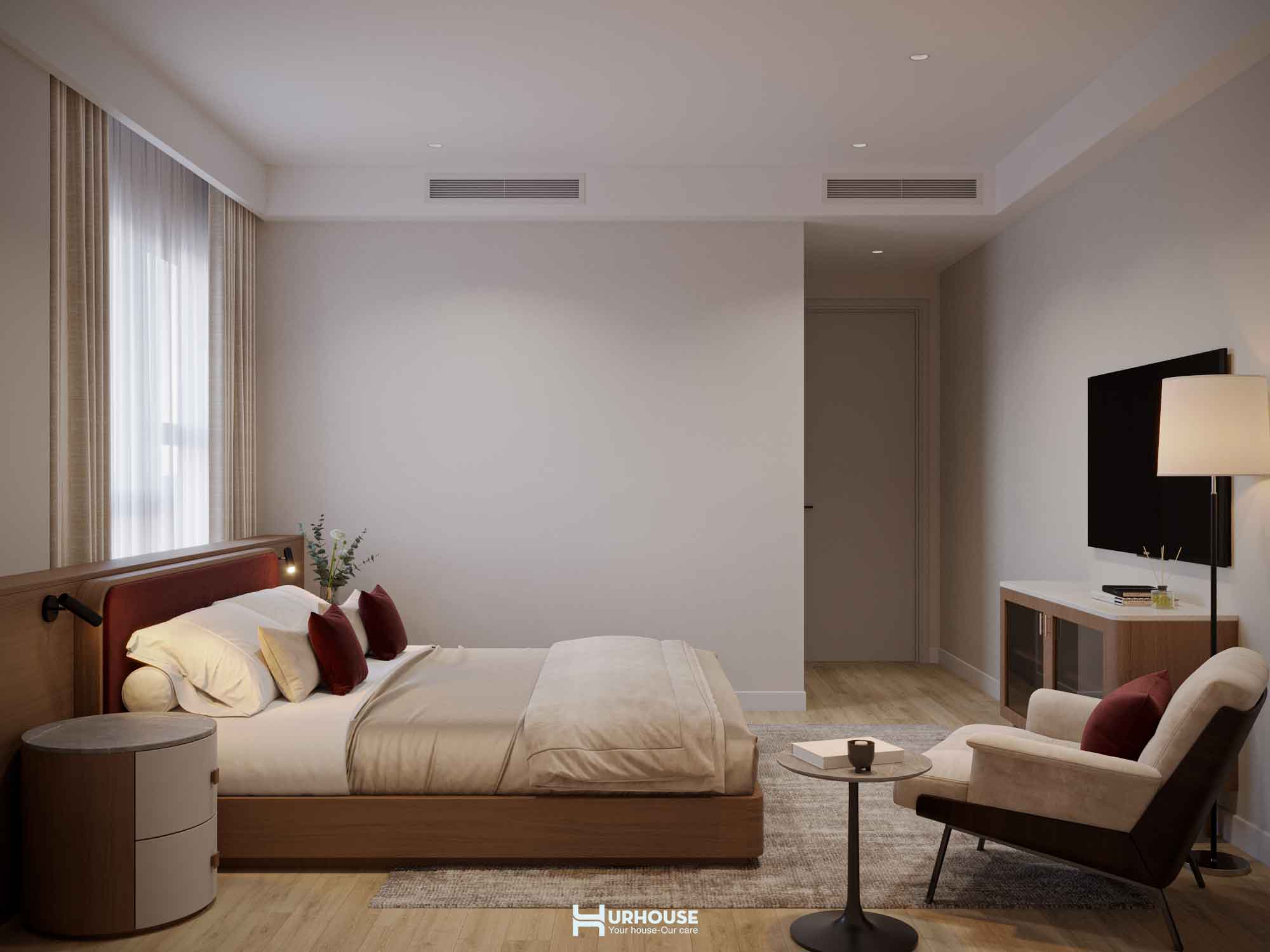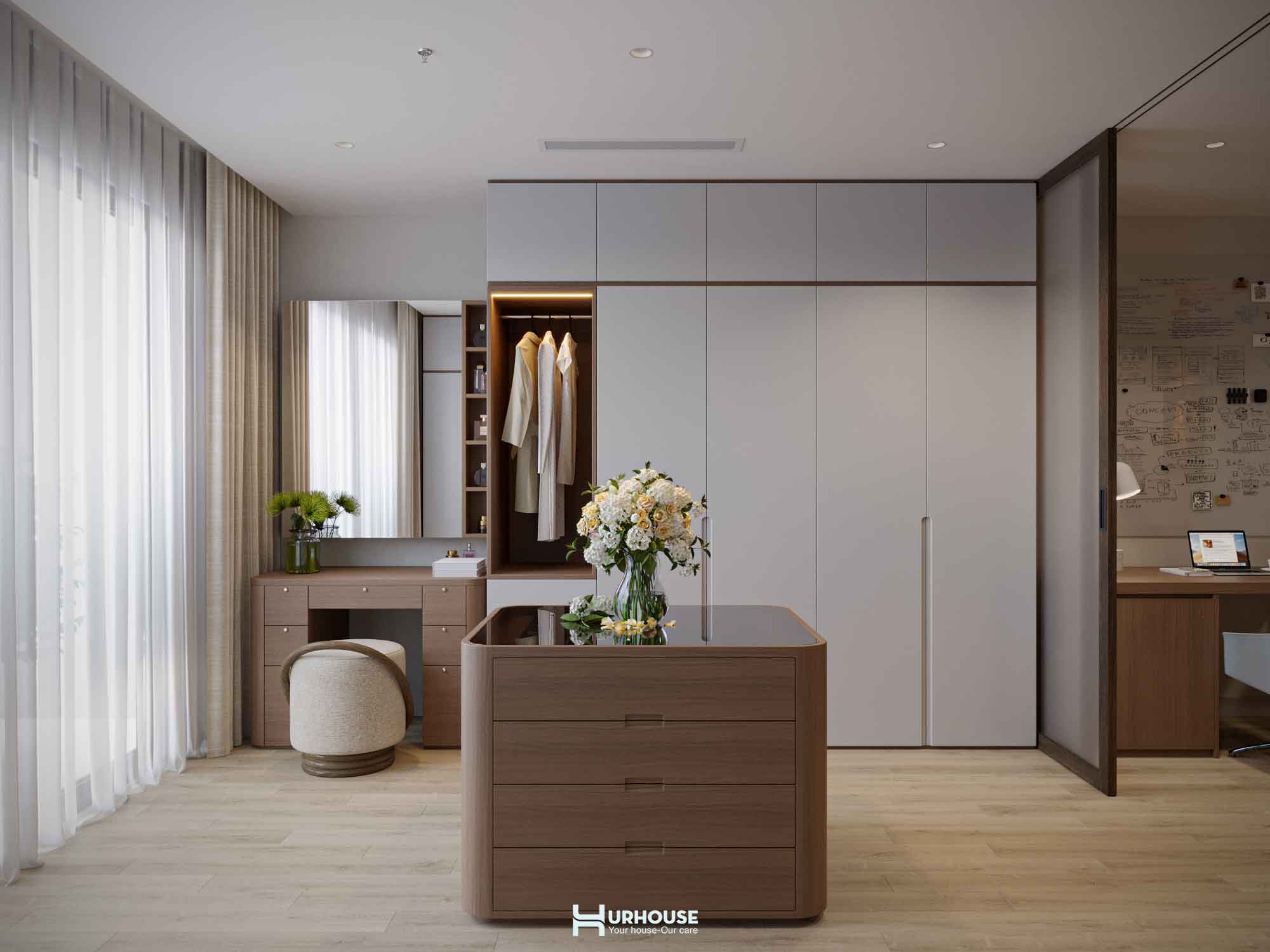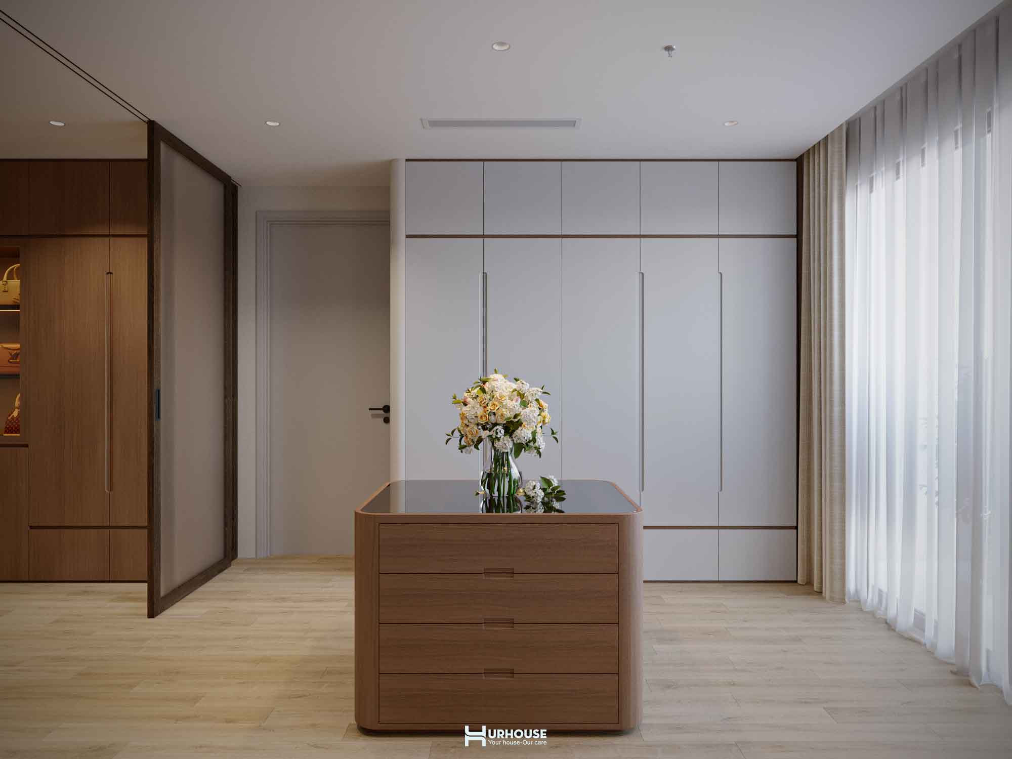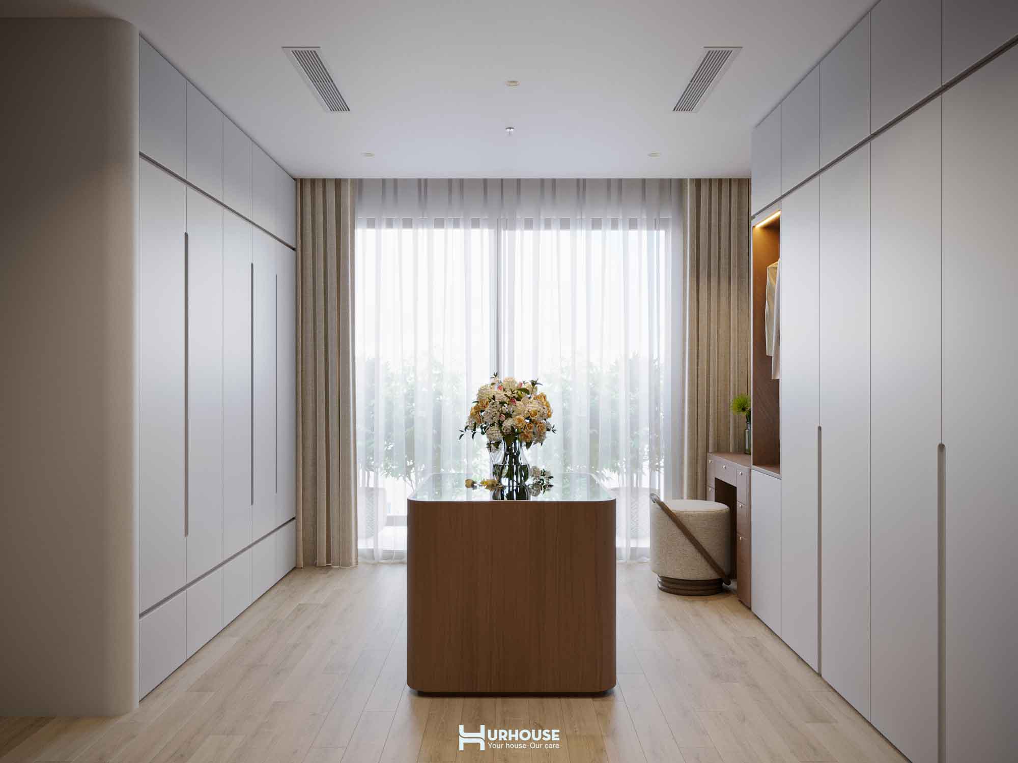 Ánh sáng tự nhiên tràn ngập khắp căn phòng qua những ô cửa sổ lớn, kết hợp cùng hệ thống rèm cửa mềm mại, tạo nên một không gian thoáng đãng và đầy đủ ánh sáng.