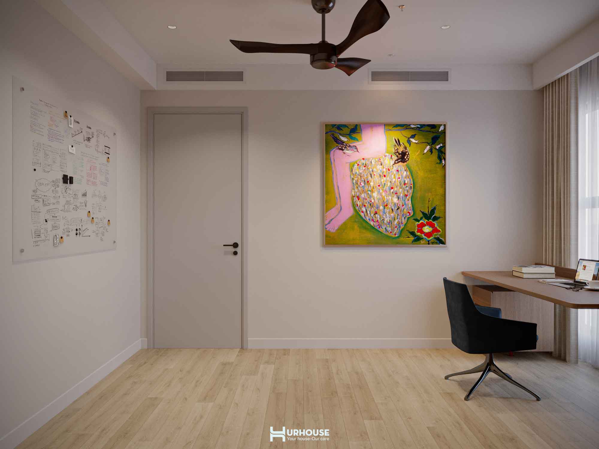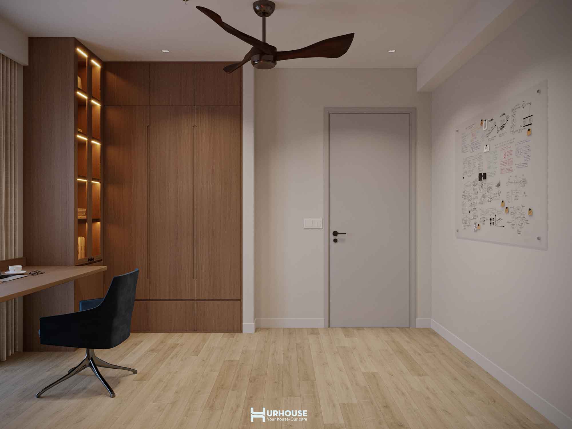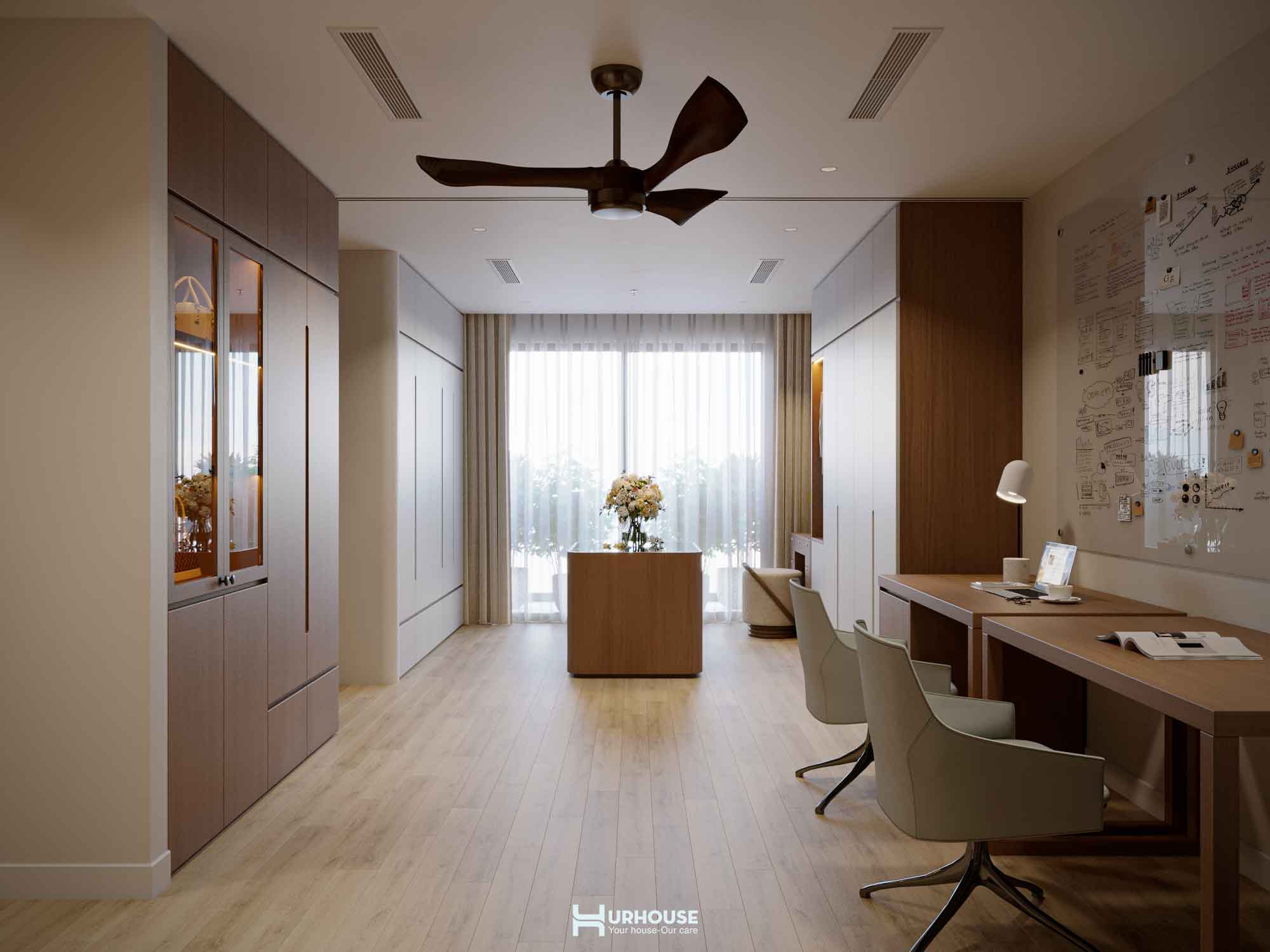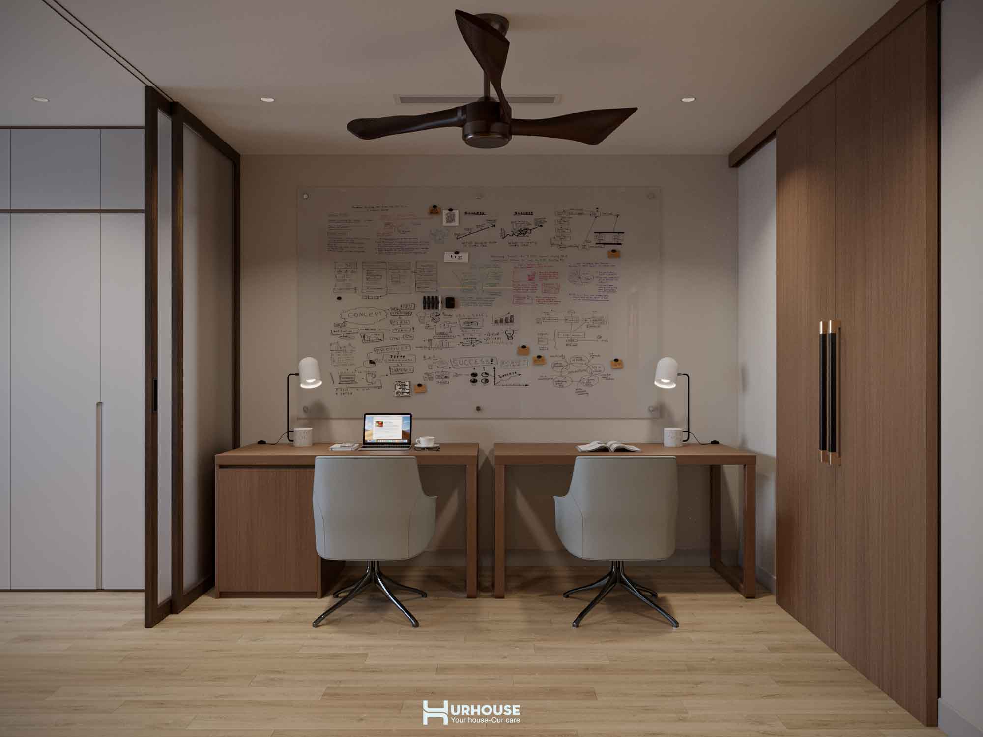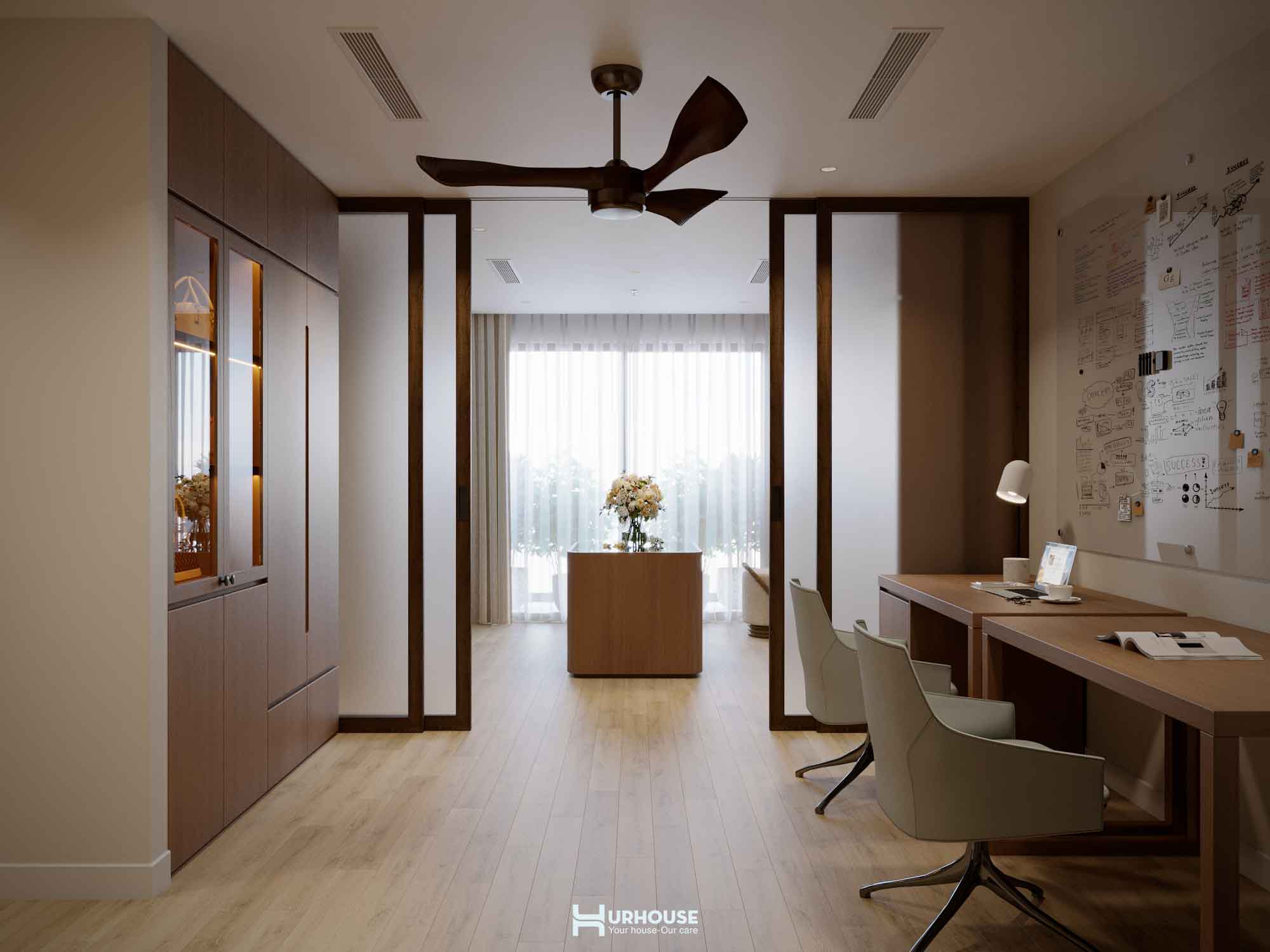 Không gian làm việc như một thư viện nhỏ sự kết hợp hoàn hảo giữa công năng và thẩm mỹ với tấm bảng trắng lớn chờ đón những ý tưởng đột phá.