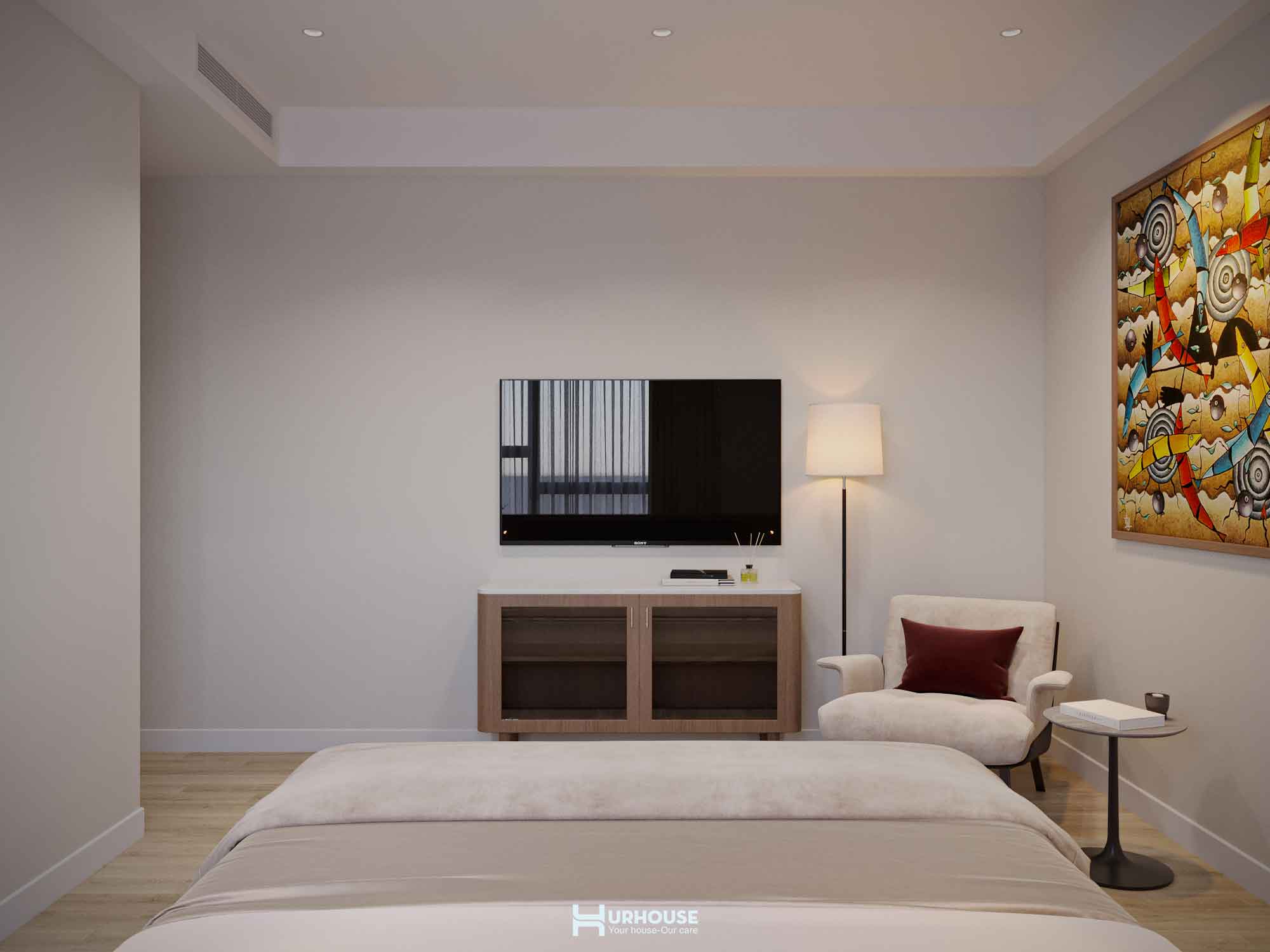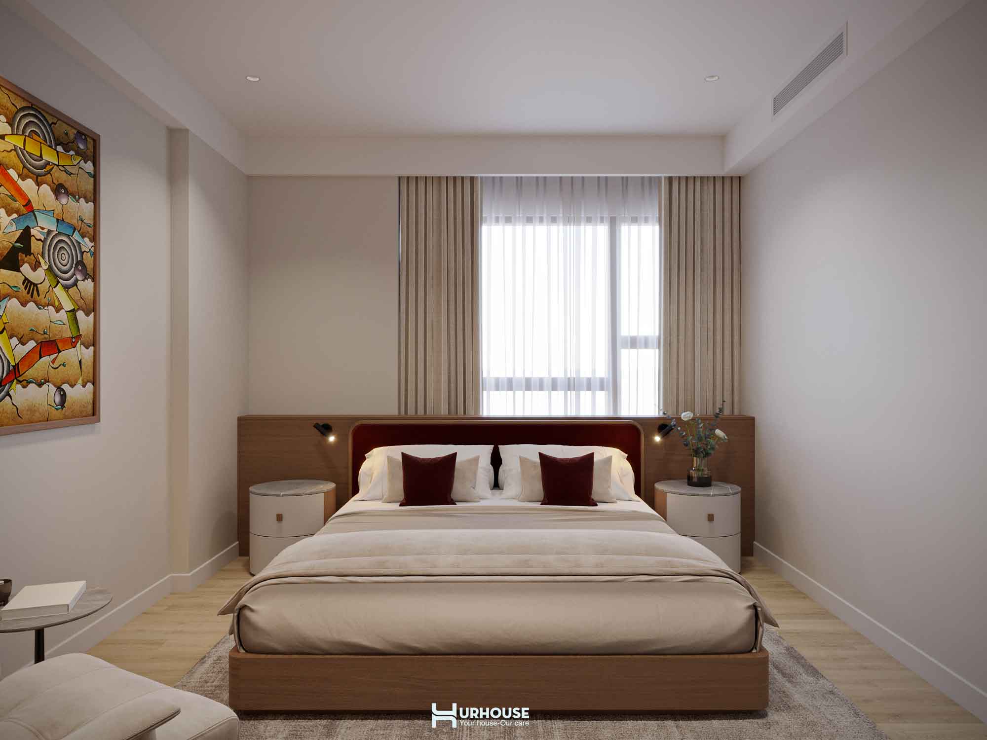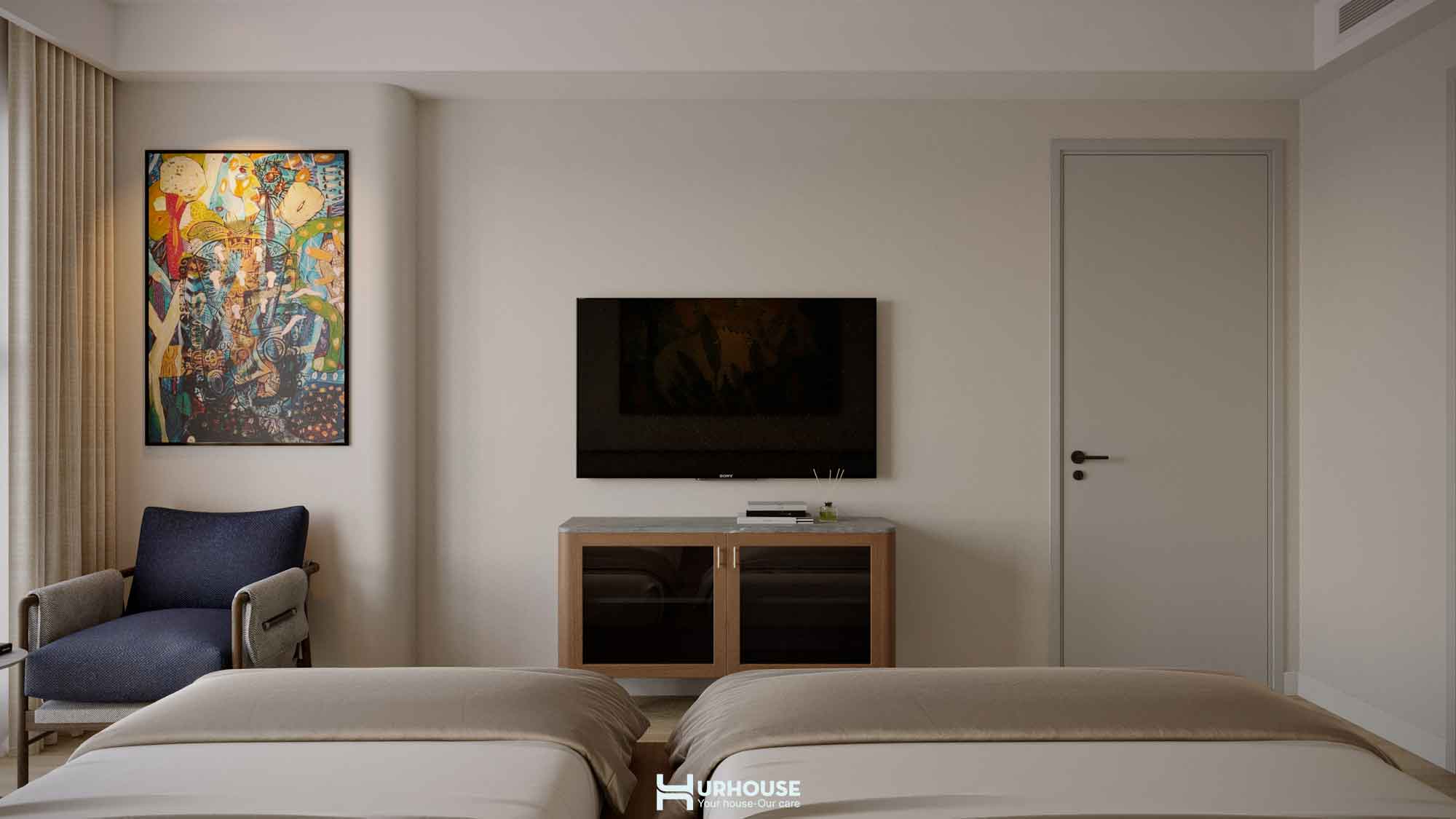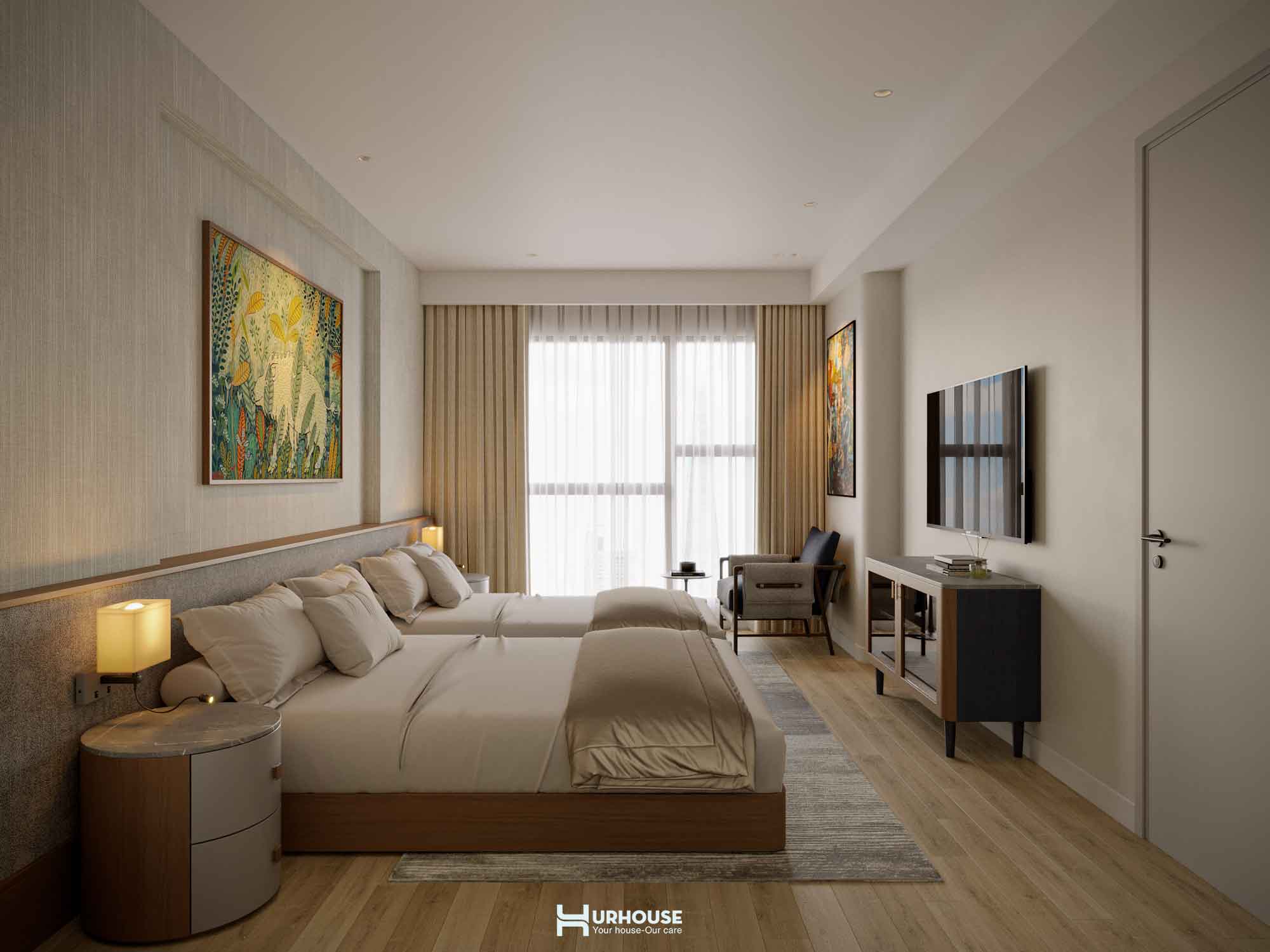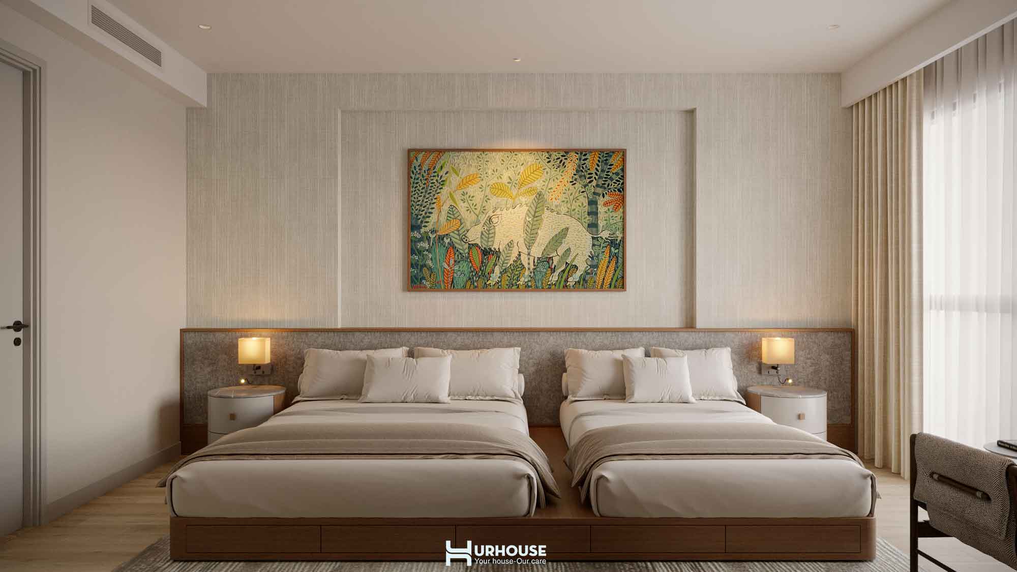 Căn phòng được thiết kế dựa theo yêu cầu của gia chủ, với hai chiếc nệm đơn đặt song song có kích thước khác biệt đảm bảo sự tiện nghi nhưng hài hòa. khung gỗ tự nhiên với sắc nâu ấm áp kết hợp với không gian dịu nhẹ tạo nên một tổng thể vừa gần gũi, vừa sang trọng. Nổi bật giữa không gian ấy là bức tranh ngay đầu giường khẽ thêm chút sinh động mà không làm mất đi sự hài hòa.
