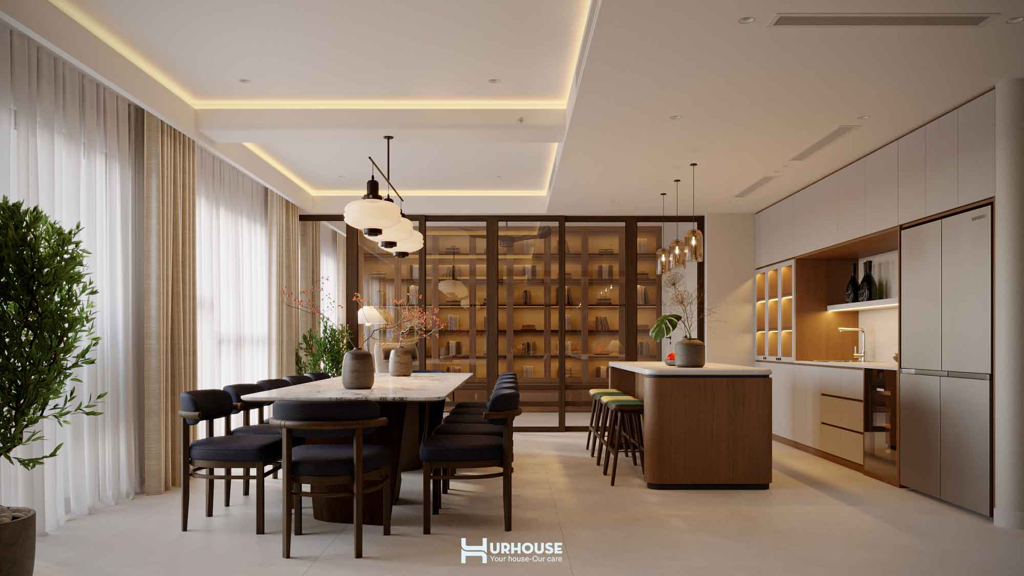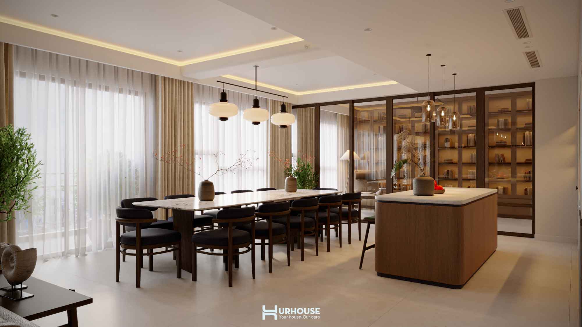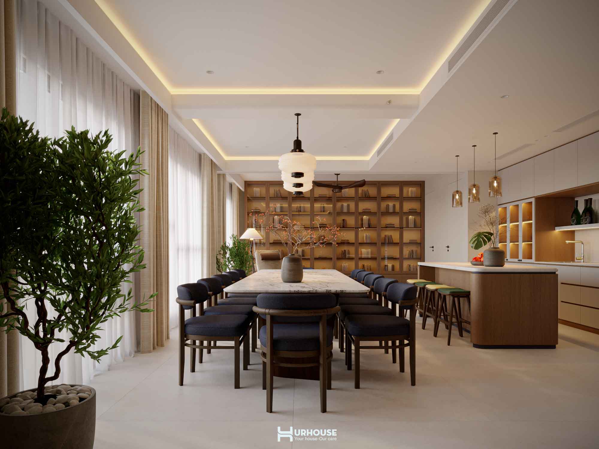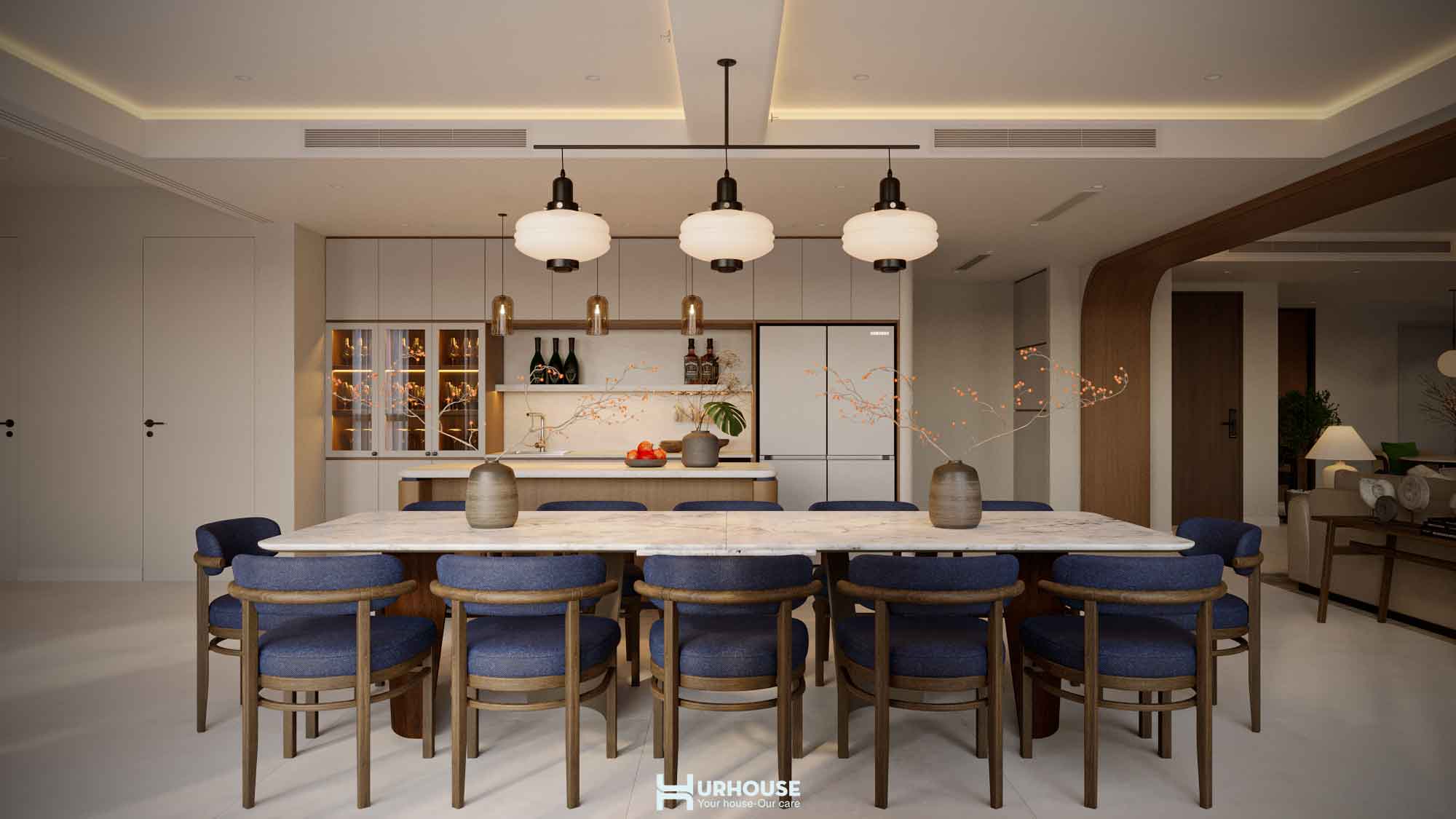 URHOUSE đã khéo léo tạo ra một không gian vừa thoải mái, vừa tiện nghi. Không gian bếp rộng rãi, bàn ăn lớn đủ để phục vụ những bữa tiệc cho tối đa 20 người. Những chiếc ghế ngồi đơn giản, bọc đệm với tông màu trung tính, được thiết kế để mang đến cảm giác thoải mái và thư giãn. Chúng hoàn toàn phù hợp với phong cách tối giản mà URHOUSE đã lựa chọn cho không gian.