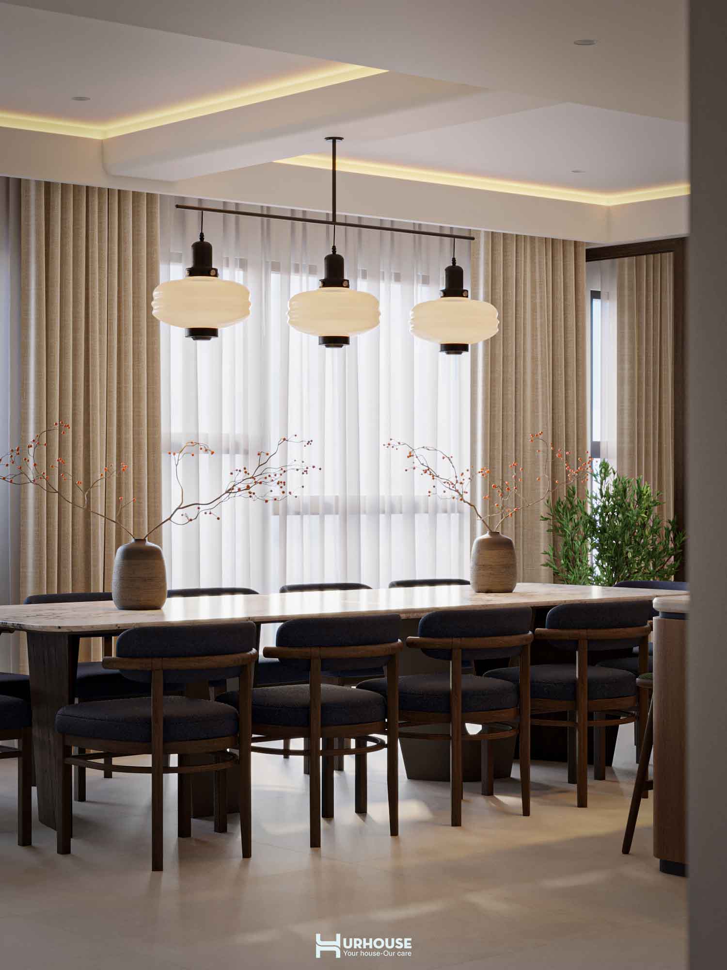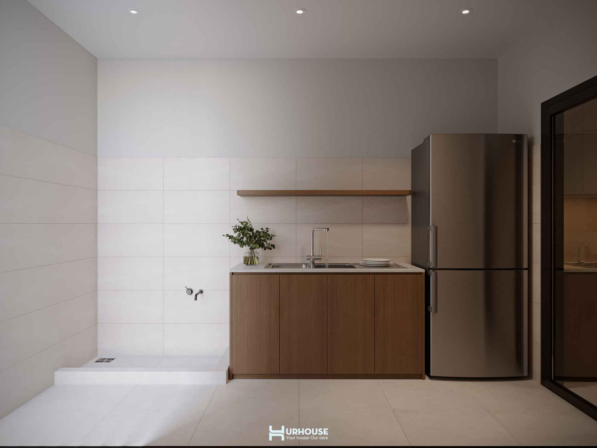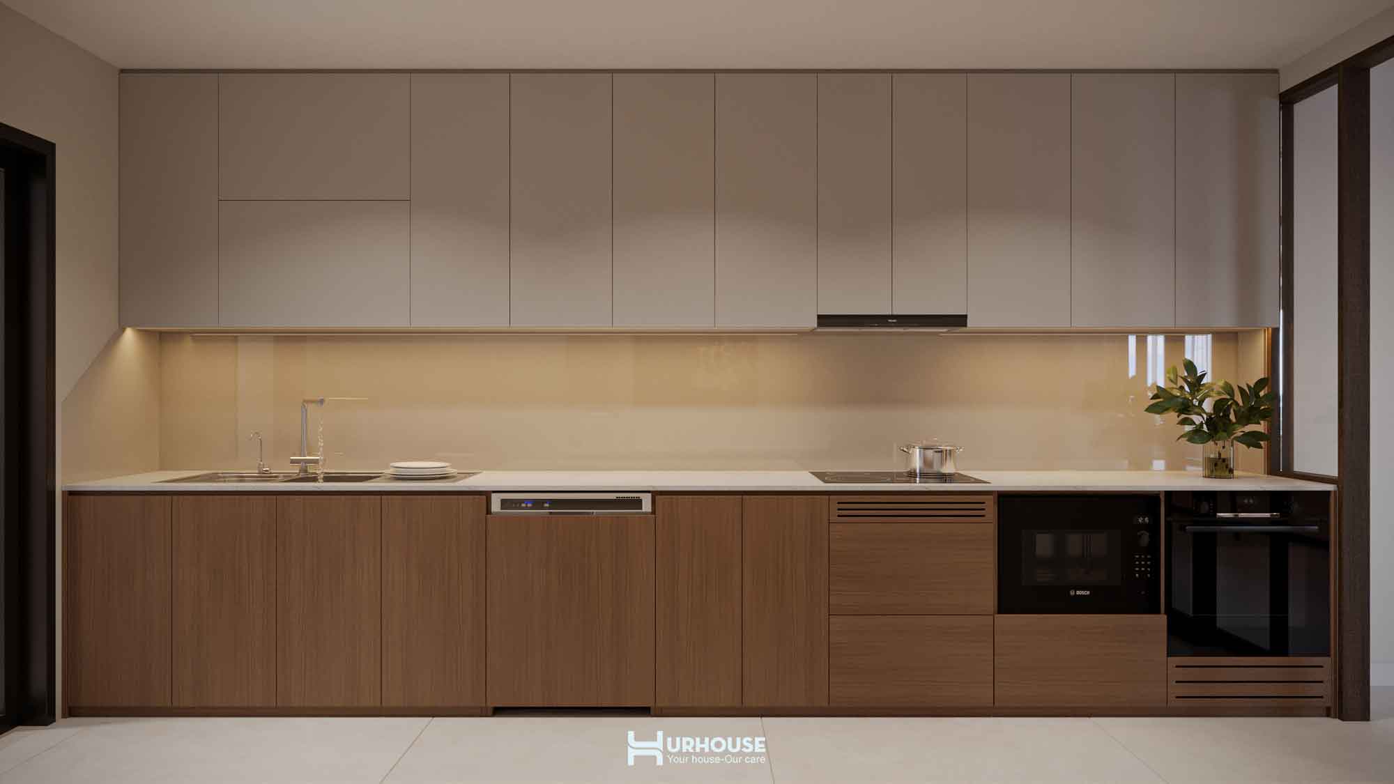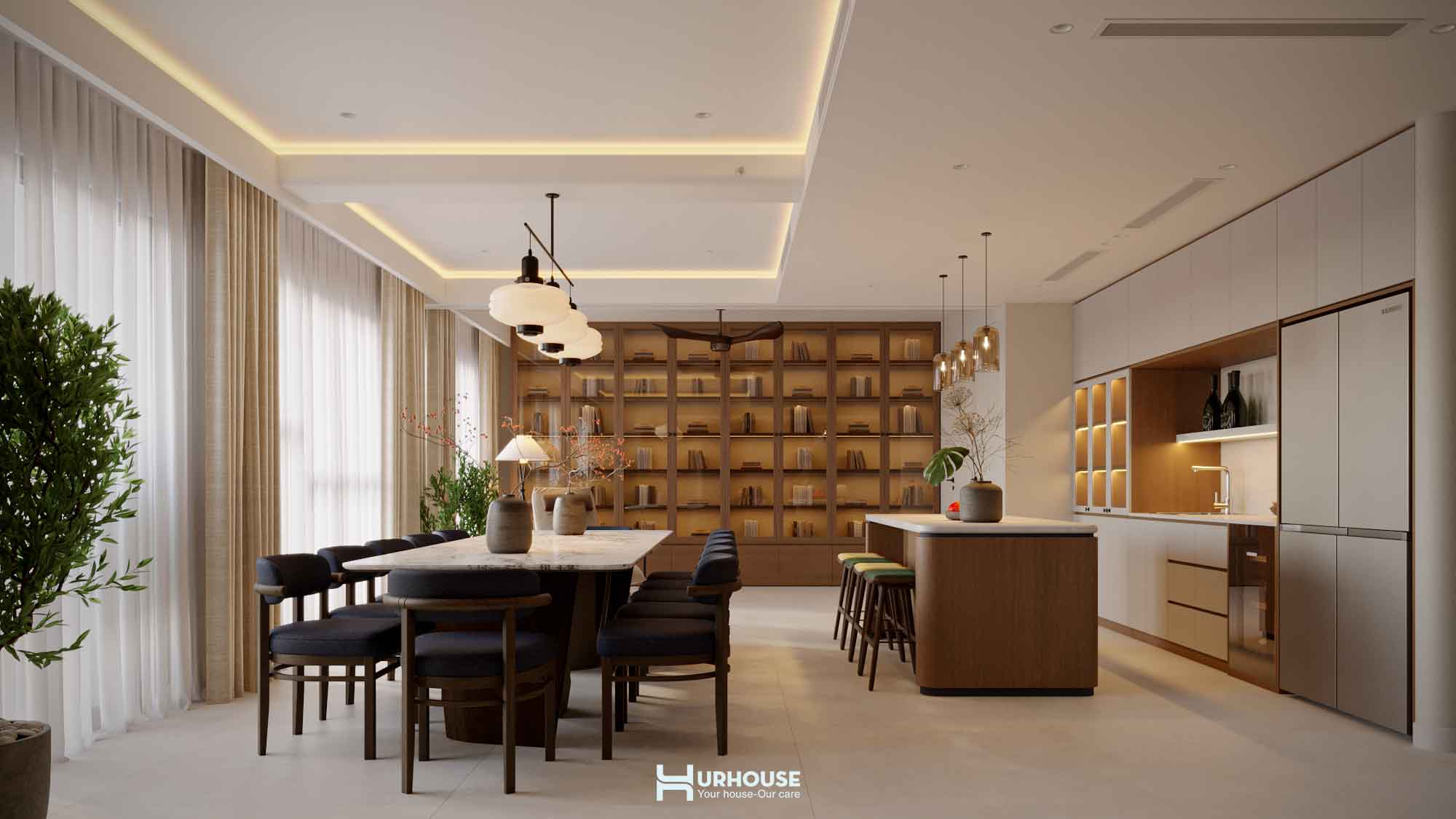 URHOUSE đã khéo léo tạo ra một không gian vừa thoải mái, vừa tiện nghi. Không gian bếp rộng rãi, bàn ăn lớn đủ để phục vụ những bữa tiệc cho tối đa 20 người. Những chiếc ghế ngồi đơn giản, bọc đệm với tông màu trung tính, được thiết kế để mang đến cảm giác thoải mái và thư giãn. Chúng hoàn toàn phù hợp với phong cách tối giản mà URHOUSE đã lựa chọn cho không gian.