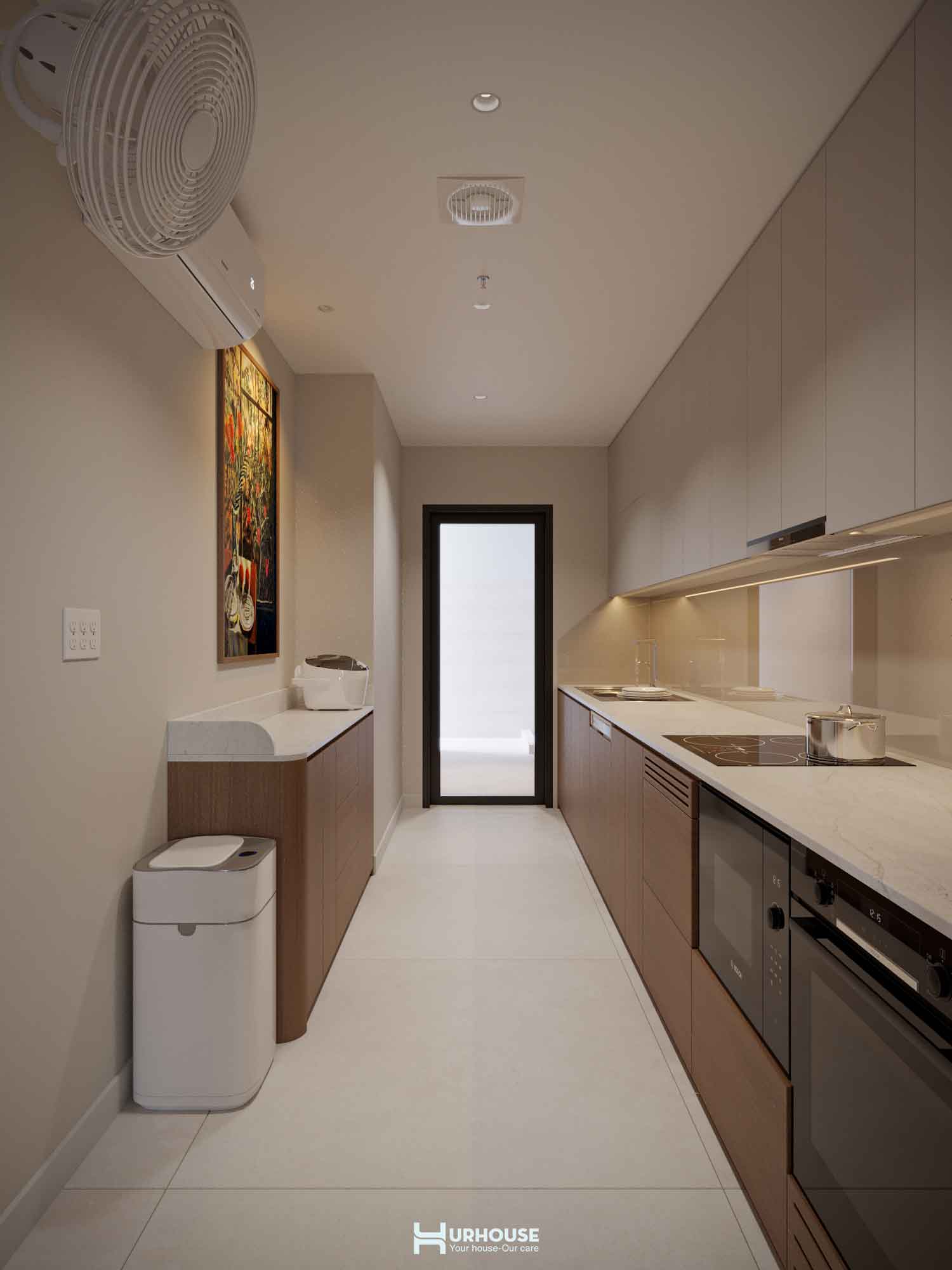 Bên cạnh đó, hệ thống ánh sáng trong không gian phòng bếp cũng được chăm chút kỹ lưỡng, có thể điều chỉnh ánh sáng linh hoạt.