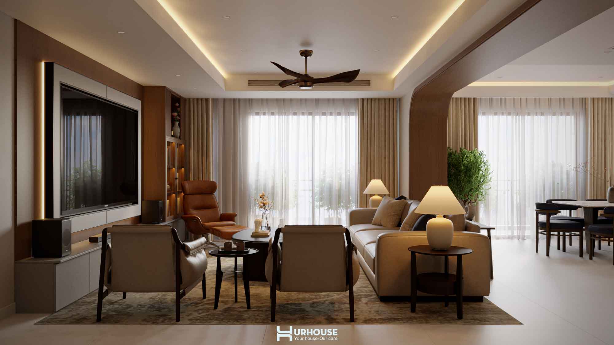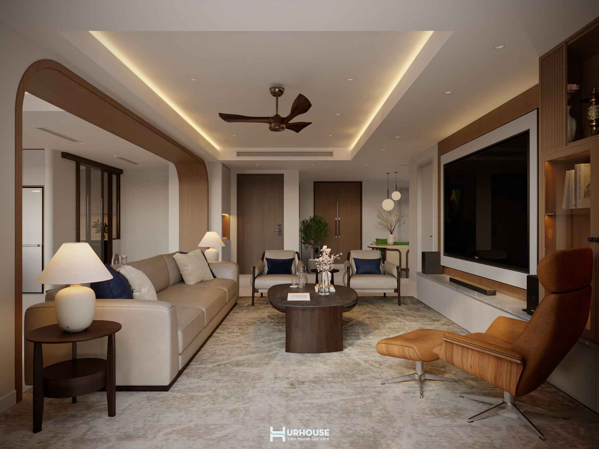 Chắc hẳn ngay từ cái nhìn đầu tiên mọi người đã cảm nhận được sự rộng rãi, thoáng đãng bao trùm không gian. Thiết kế không gian mở và không bị gò bó bởi những bức tường khô cứng. Ánh sáng tự nhiên từ những khung cửa sổ lớn len lỏi khắp không gian, tuy không gian mở là thế nhưng mỗi khu vực chức năng vẫn giữ được nét riêng biệt. Bộ sofa êm ái, chiếc bàn trà tinh tế và hai chiếc ghế đơn duyên dáng tạo nên một góc sinh hoạt chung của các thành viên trong gia đình thật ấm cúng, nơi những câu chuyện được sẻ chia và những tiếng cười được lan tỏa.
