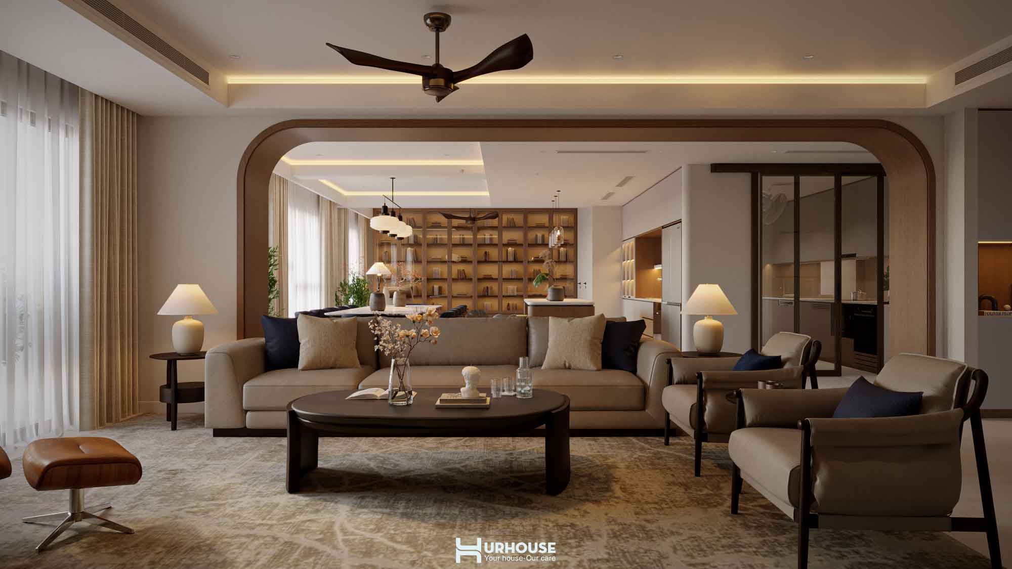 Hình dung một không gian làm việc nơi bạn có thể vừa soạn thảo tài liệu, vừa nhâm nhi tách cà phê trong sảnh thư giãn. Đó chính là điều mà Urhouse đã mang đến cho gia chủ trong thiết kế lần này, với việc thiết kế phòng làm việc liền mạch với sảnh thư giãn tạo nên một môi trường làm việc mở, thoáng đãng, xóa bỏ cảm giác bị giới hạn trong một căn phòng kín.